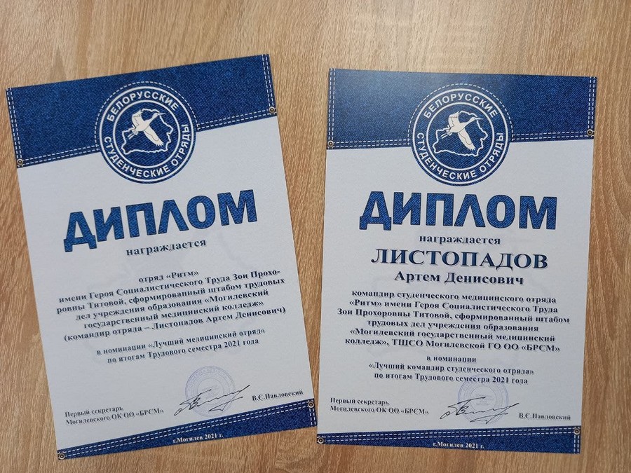 По итогам работы в номинации «Лучший медицинский отряд» дипломом награжден студенческий отряд «Ритм» имени Героя Социалистического труда Зои Прохоровны Титовой, сформированный штабом трудовых дел Могилевского медицинского колледжа. Командир отряда – Листопадов Артём Денисович, учащийся группы 3ЛД20, – признан лучшим командиром студенческого отряда и награжден дипломом.
