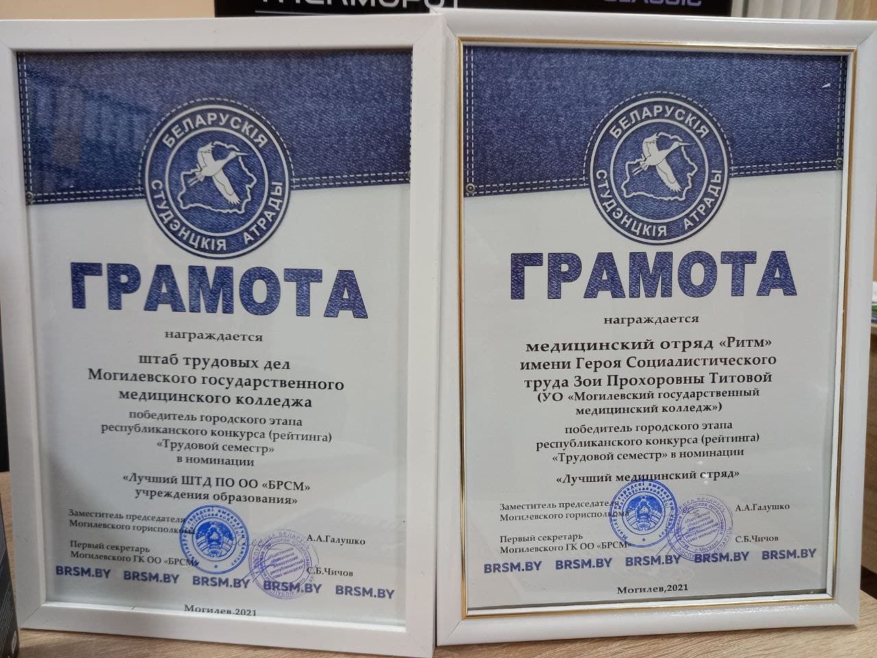 По итогам городского этапа республиканского конкурса (рейтинга) «Трудовой семестр» победителем в номинации «Лучший медицинский отряд» стал наш студенческий медицинский отряд «Ритм» имени Героя Социалистического труда З.П. Титовой, а штаб трудовых дел Могилевского медицинского колледжа – победитель в номинации «Лучший ШТД ПО ОО «БРСМ». Командир и комиссар отряда также были награждены грамотами.