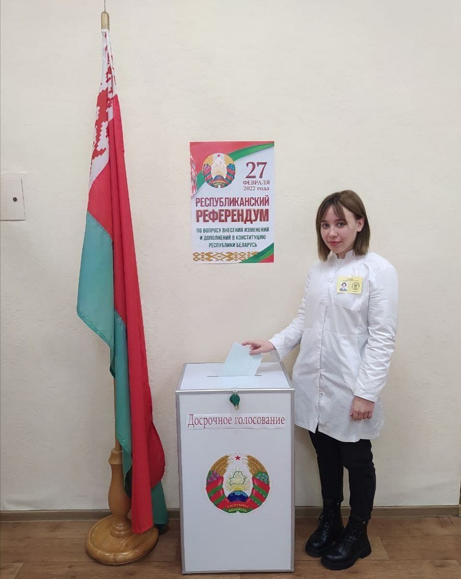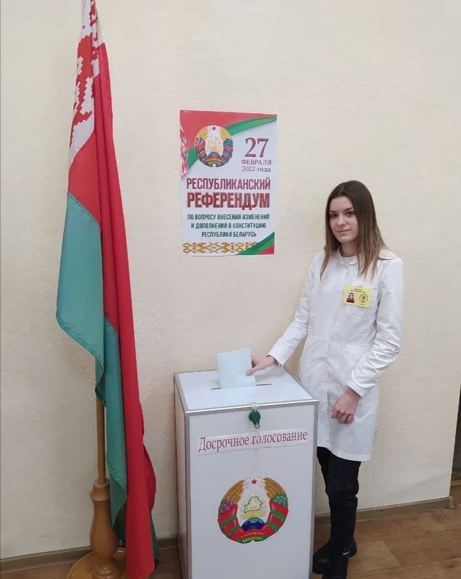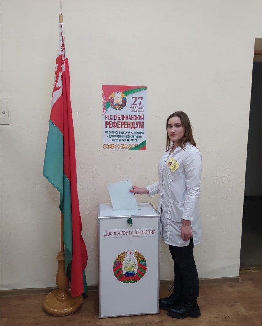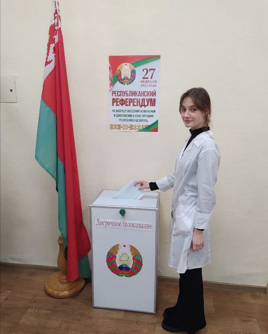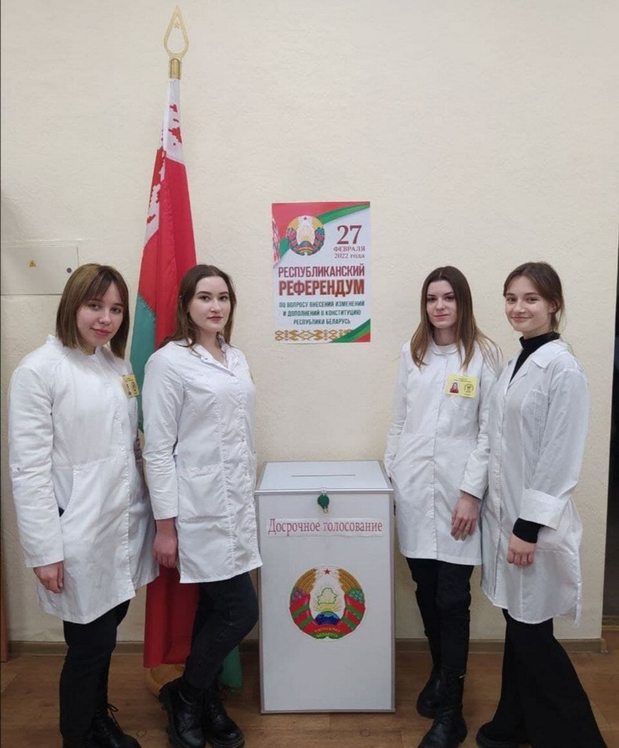 Республиканский референдум по внесению изменений и дополнений в Конституцию Республики Беларусь пройдёт 27 февраля 2022 года. Сегодня, 22 февраля, в 10 часов открылись все участки для голосования. На участок № 40 Ленинского района г. Могилева первыми пришли досрочно проголосовать учащиеся Могилевского медицинского колледжа Скуренок Дарья, Услистова Карина, Горлова Татьяна и Савичева Юлия из группы 3СД21.